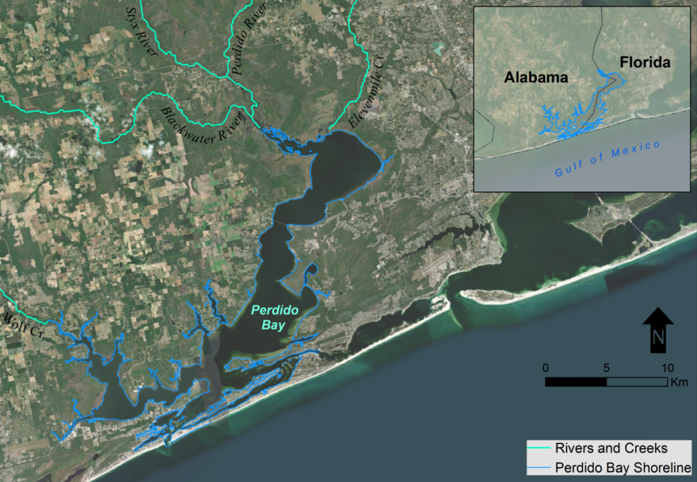 Perdido Bay is a small, shallow estuary located on the Northern Gulf of Mexico just east of Mobile Bay. The bay is characterized by a surface area of approximately 130 km2 (50 mi2), with a drainage area of over 3,238 km2 (1,250 mi2). The drainage area includes land, tributaries, lagoons, and bayous. The region has high species diversity, including shrimp, crabs, scallops, and trout, but the Bay is impacted by runoff from agricultural and silvicultural lands and point source discharge from industry.
