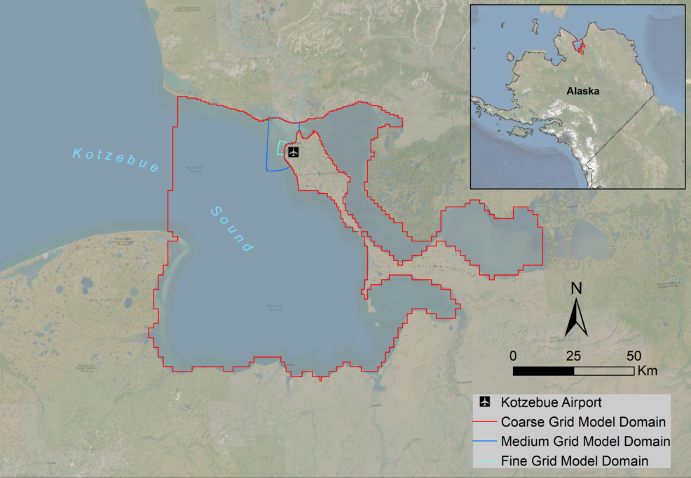 The Kotzebue Sound located on the North end of Alaska, receives freshwater inflow from a drainage area of approximately 41,000 mi2 (106,000 km2), with the major rivers including Noatak River, Kobuk River, and Selawik River. The Kotzebue Ralph Wien Memorial Airport (OTZ) located near the coast is a vital air traffic link for the local area. The airport has a single runway that is aligned nearly perpendicular to the shoreline. OTZ has been the subject of considerable study over the past several years, including the idea of relocating the airport. The final airport relocation feasibility study, released in 2008, concluded that relocation was not feasible due to funding constraints. Subsequently, the Alaska Department of Transportation & Public Facilities moved forward with expanding the Runway Safety Areas (RSAs), conducting a practicability study in 2010. In 2012, the final environmental assessment (EA) for expanding the RSAs was approved, and construction began in 2013.
