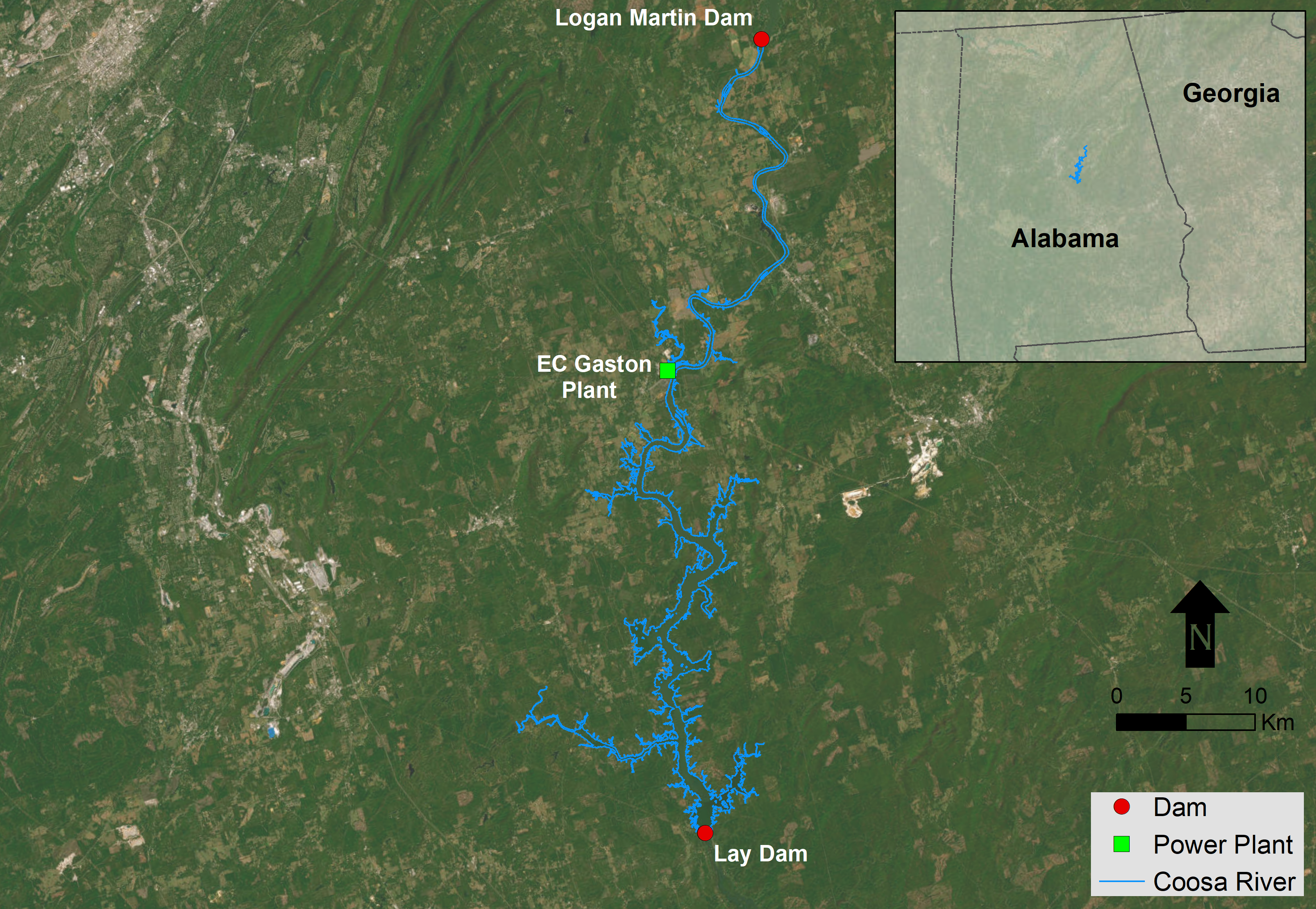 The Coosa River is one of the most developed rivers in Alabama, USA. The river is used for recreation, drinking water, power generation, agriculture, and timber. One section of the Coosa River between Logan Martin and Lay dams is the Lay Lake which was impounded by one of the earliest concrete dams in the US. The hydrodynamics and thermodynamics of this lake are strongly governed by the operation of the hydropower plants at the Logan Martin and Lay dams and Ernest C. Gaston thermal power plant.