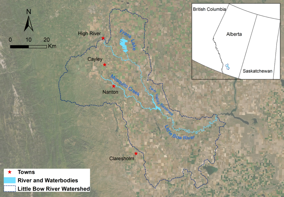 The Little Bow River watershed is located in the headwaters of the Oldman River Basin in the southern region of the Province of Alberta. As a major tributary of the Oldman River, the Little Bow River receives diverted flows from the Highwood River, direct precipitation, local runoff, and municipal/industrial discharges. The Upper Little Bow River Basin occupies an area of approximately 3,491 km$^2$, and supports a wide variety of natural resources, including forests, minerals, wildlife, and agricultural lands.
